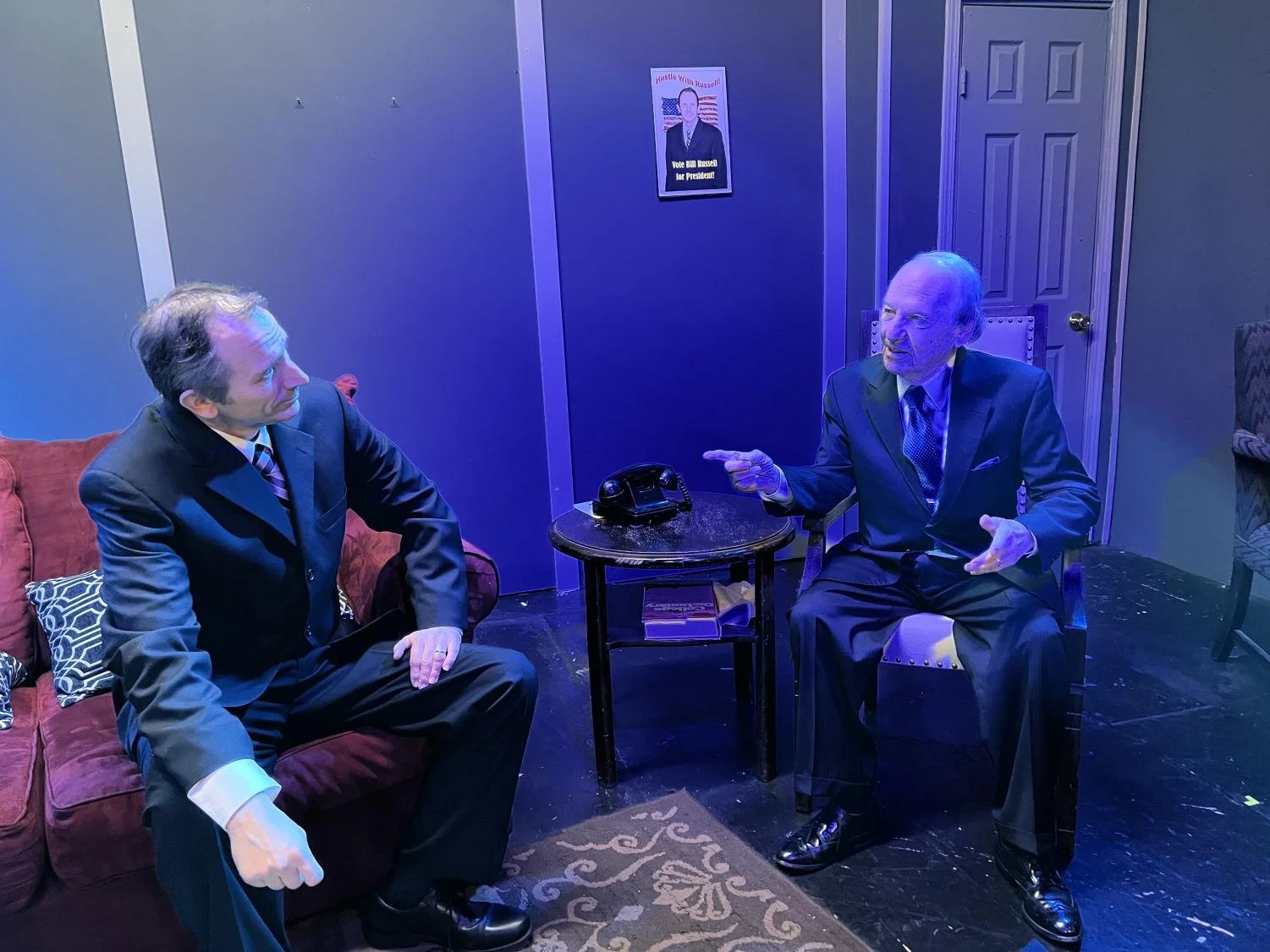 The tone of the scene shifts early into ‘The Best Man’ when Former President Art Hocksteader (Stephen Kauffman, right) announces he is dying to presidential candidate Bill Russel (Tom Loeprich, left). Russel struggles to pursue political success while still staying true to his ethical principles. Photo by Odin Rasco